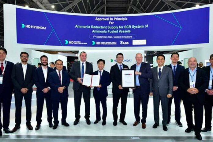 ABS issued an approval in principle (AIP) to HD Korea Shipbuilding & Offshore Engineering (KSOE) and HD Hyundai Heavy Industries (HHI) for its ammonia reductant supply system for selective catalytic reduction (SCR) in ammonia-fueled ships. Representatives from both companies and the Liberian International Ship & Corporate Registry (LISCR) met at Gastech 2023 for the AIP presentation.