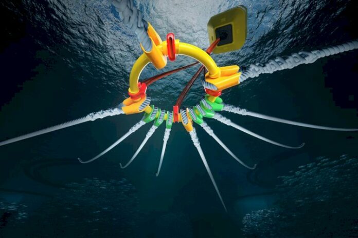 The main component of the system is a flexible coupling ring in polyurethane (with an endless steel rope as core) which acts as a coupling point for anchor lines and attachment point for buoyancy buoy in a frame mooring. The system has low weight, long service life and long inspection intervals.