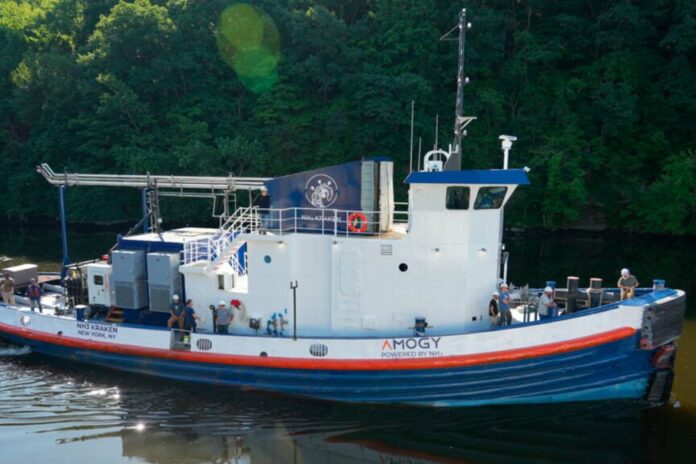 The NH3 Kraken, a tugboat originally constructed in 1957 and retrofitted with Amogy’s ammonia-to-electrical power system, sailed on a tributary of the Hudson River, upstream from New York City.
