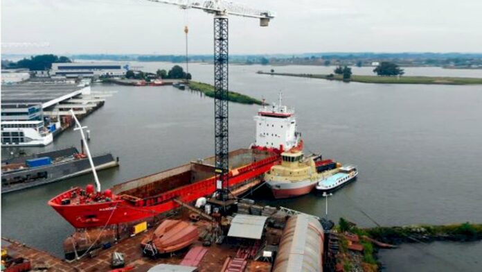 Early this year, Faasse bought the freighter MS Mandeo in order to be converted into the trailing suction hopper dredger Schenge. After its completion in 2020, the vessel will be deployed for sand extraction in the North Sea. The Schenge has a hopper capacity of approximately 2600 m3, divided over two holds so that it can carry two types of product. For the electric drive of the dredging installation and jet pumps, a shaft generator with matching frequency drive from Bakker Sliedrecht is added, which is connected to the existing main engine by means of a new PTO shaft. The vessel has an adjustable propeller (CPP). Because the main engine runs at a low load for propulsion during dredging, this power can be used for the electrical dredging installation.