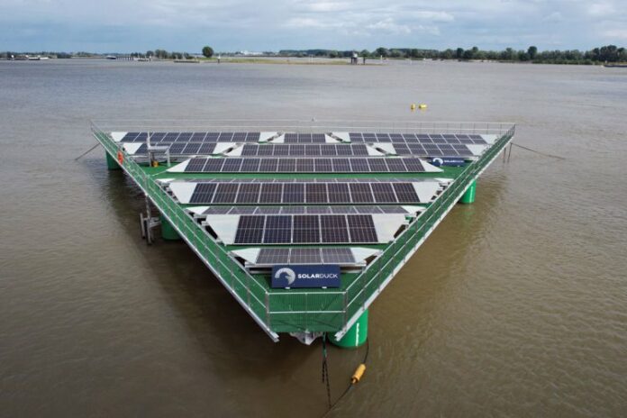 Launched in April, SolarDuck’s first pilot ‘King Eider’ consists of four triangular-shaped units, which are mounted by 156 solar panels and deliver a combined electrical output of 64 kWp to the grid. The project was deployed in IJzendoorn, in the Netherlands. The structure holds the solar panels more than three meters above water level. The platform is designed to handle coastal sea conditions and hurricane-force winds. It is also optimized for offshore sites in estuaries, natural harbours, as well as near-shore sites.