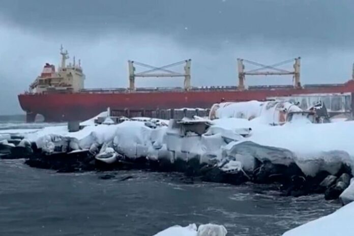 Limarenko stated that rescuers cannot approach the vessel due to a strong storm. Therefore, a decision on unloading or removing it from the shallows will be made when the weather improves.