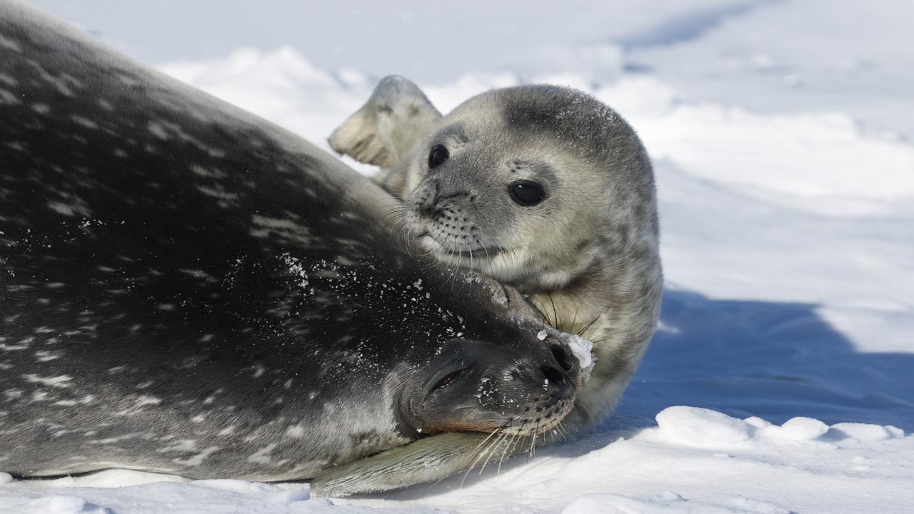 Photo: Occasionally the station is visited by emperor penguins (in the foreground), whose colonies are hundreds of kilometres away. The penguins that breed near the station are subantarctic penguins, or gentoo penguins (in the background). They have a large colony directly on Galindez Island. Due to global warming, this sub-Antarctic penguin species is moving south. Previously, these penguins haven’t formed colonies near the station.