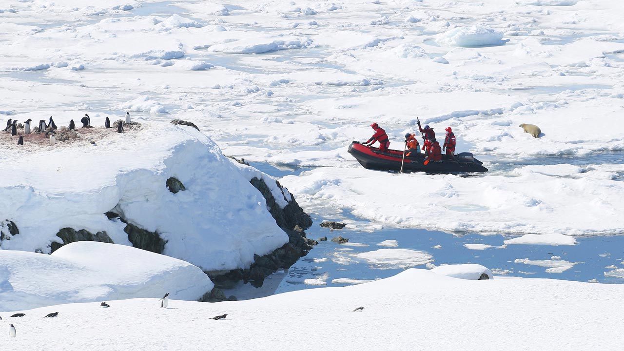 Photo: The scientists return to the station by boat after work on other islands. The icy situation near the station is unfavourable for movement.