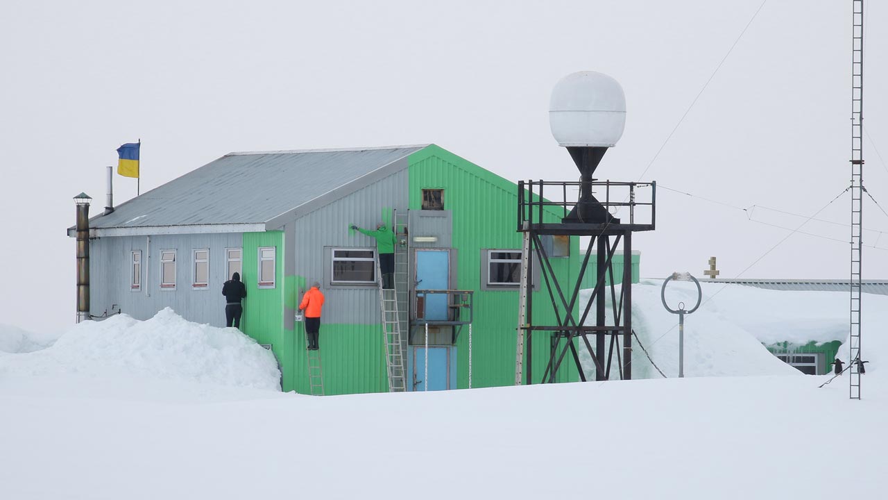 Photo: Participants of the 24th Ukrainian Antarctic Expedition (UAE) paint the facade of the station.