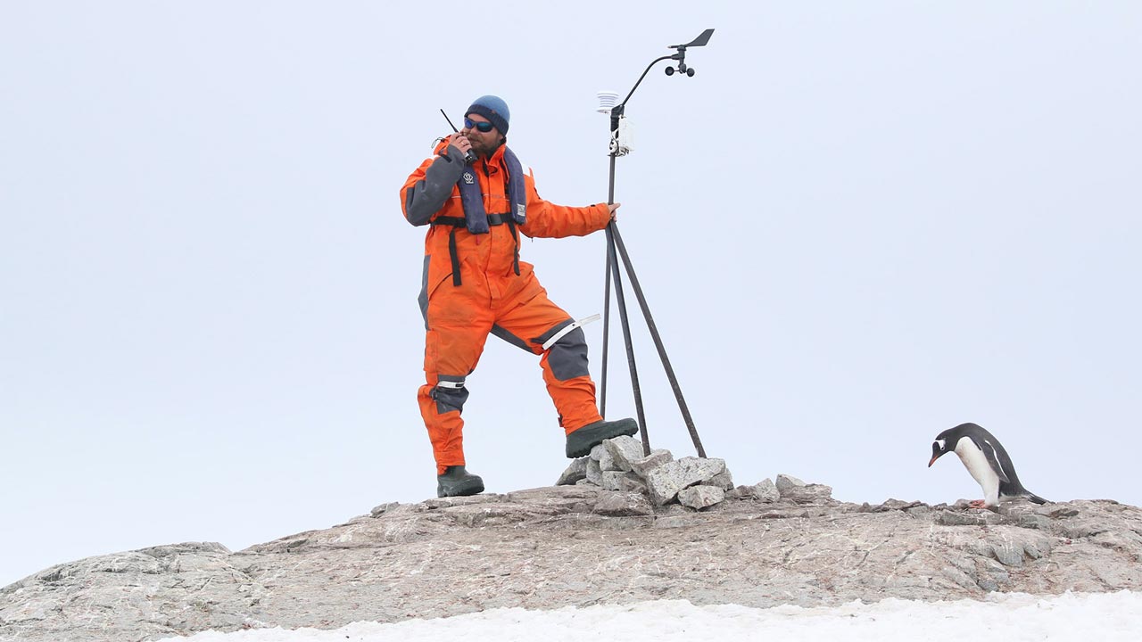 Photo: Meteorologist Alexander Zulas checks the operation of the weather station on Peterman Island.