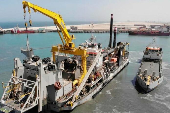 In the port of the capital Nouakchott, the vessel is working for developer ARISE Mauritania, on the deepening of the access channel, the port basin and the new berth alongside the new ARISE port terminal.