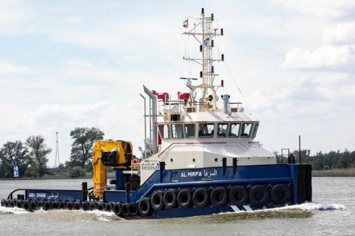 Damen Shipyards Group has delivered a new Shoalbuster 3209 to SAFEEN Group, a subsidiary of AD Ports Group. The vessel was named Al Mirfa, after a coastal community located in the Al Dhafra region of Abu Dhabi, in a ceremony that took place at Damen Shipyards Gorinchem in the Netherlands.