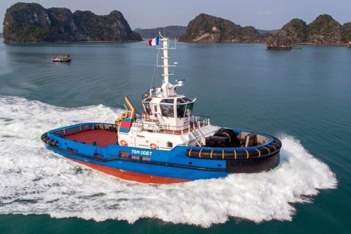 TSM Odet was built at the Damen Song Cam yard in Vietnam and sailed on her own keel to Port of Sète, which took just over 50 days, consuming just over 3 m³ of fuel per day. The rounded hull shape of the Damen ASD Tug 2811 is based on the successful ASD 2810 model and is considered as one of the most efficient hull forms for tugs. TSM will employ the new vessel in port operations, terminal operations and sea towage.