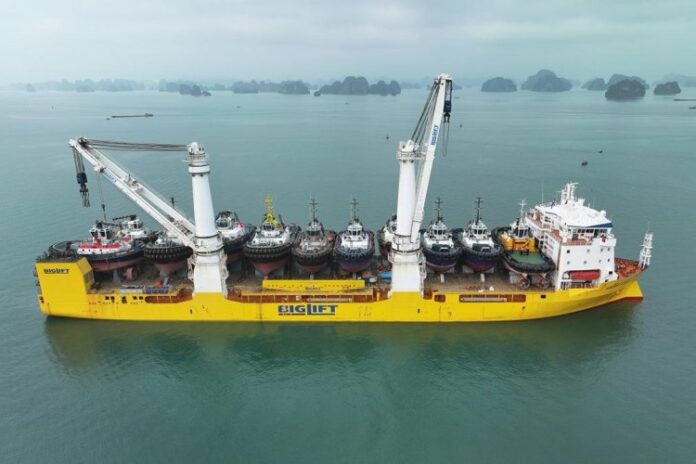 Damen Shipyards and BigLift Shipping have completed a major logistical feat. A single vessel has transported eleven Damen tugs from the shipbuilder’s yards in Vietnam and China to Europe.