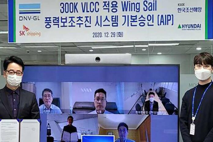 The wind-powered auxiliary propulsion system for ships is the result of a joint research project from KSOE, the shipbuilding holding company of Hyundai Heavy Industries Group, and SK Shipping, to develop wind-powered eco-friendly propulsion solutions.