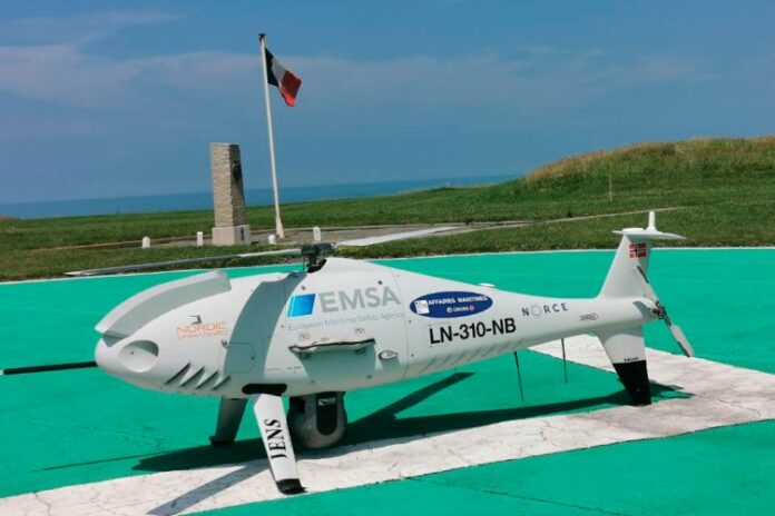 The RPAS used is an unmanned helicopter Schiebel Camcopter S100 which is operated by EMSA’s contractor Nordic Unmanned and is equipped with an emissions sensor from Explicit that analyses the gas samples taken when the drone passes through the exhaust plume of the ship’s funnel or stack.