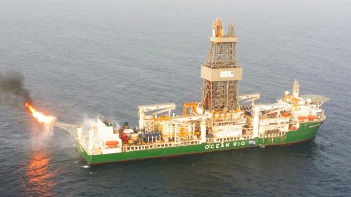 The drillship Poseidon drilled the Agogo-1 NFW well in 1,636 m (5,367 ft) water depth, 180 km (112 mi) offshore and around 20 km (12.4 mi) west of the FPSO N’Goma serving the block’s West Hub.