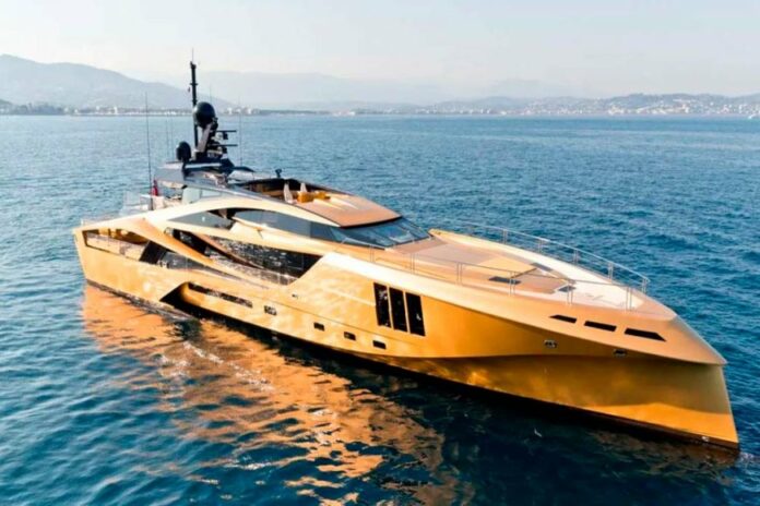 Some yacht owners like to be inconspicuous. That’s not the case for the owner of the 162-foot Khalilah, whose sports yacht is painted gleaming gold, has its own matching miniature chase boat and has a unique carbon-fiber construction that ensures reduced fuel consumption and maximum efficiency.