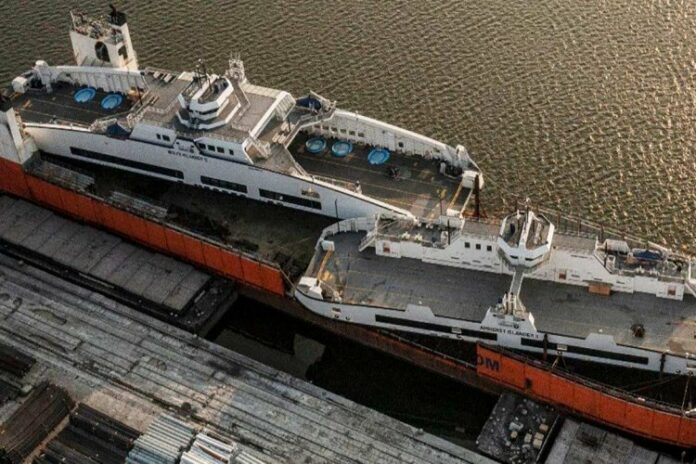 The first, fully-electric road ferries to sail in North America are now on their way from Damen Shipyards Galati to Lake Ontario, Canada, to begin operations. Ordered by the Ministry of Transportation, Ontario, Canada, the Amherst Islander II and Wolfe Islander IV, 68 and 98 metres in length respectively, represent a new generation of zero-emission large ferries. The vessels departed the yard on 26 August to be loaded on the semi-submersible transport vessel Super Servant 4 and will arrive in Lake Ontario in mid-September.