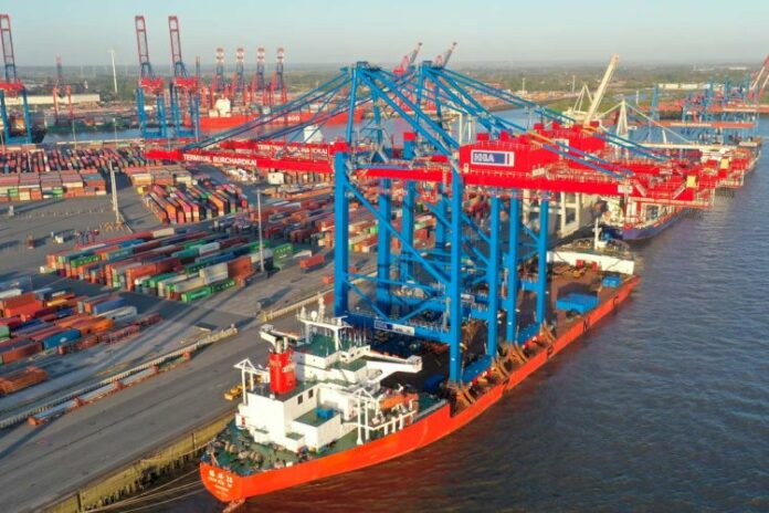 The two state-of-the-art container gantry cranes arrived at their temporary berth at Athabaskakai on board the “Zhen Hua 26”. Preparations for the complex discharging process will take place there before the special ship shifts to their final location at berth 6 in the Waltershofer Hafen.