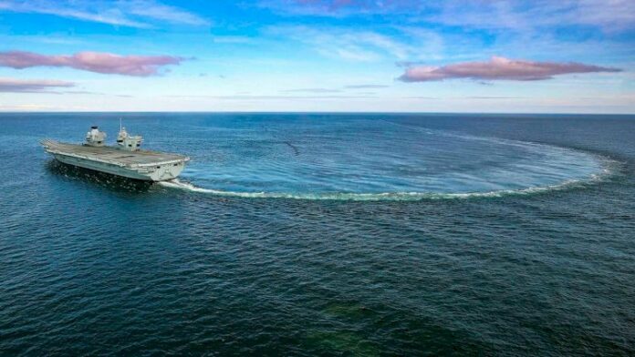 It took almost all the 109 Megawatts of power – enough to meet the needs of a city the size of the carrier’s home of Portsmouth – the six engines generate to propel the 65,000-tonne warship along at full speed.