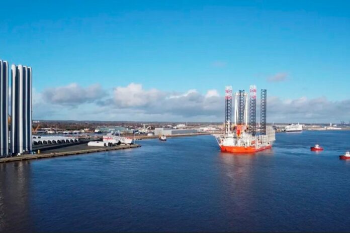 Officials said the vessel, which is 162m (530ft) long and 60m wide, was capable of transporting and installing seven turbine sets per load.