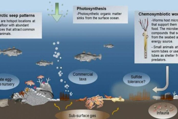 Fluids and gas escaping from these reservoirs can migrate toward the seafloor and be released into the ocean. Evidence of hydrocarbon seepage is widespread in the Barents Sea and other regions of the Arctic, and what is only now being more fully appreciated is the extent to which leakages from these reservoirs are a source of energy for many components of the marine ecosystem at high latitudes.