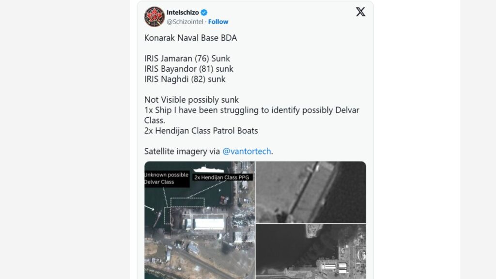 The information has only been partially confirmed. According to satellite images published by observer Intelschizo, three vessels were confirmed sunk at the Iranian Navy’s Konarak base: the light frigate IRIS Jamaran (76) of the Moudge class, and the corvettes IRIS Bayandor (81) and IRIS Naghdi of the Bayandor class.