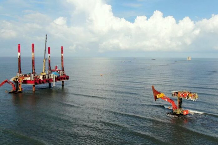 Jan De Nul’s Cable-Laying Vessel Willem de Vlamingh successfully installed the four subsea export cables from the offshore wind farm site, 10 km off the coast, to the shore where they were connected at the landfall area near Fangyuan.