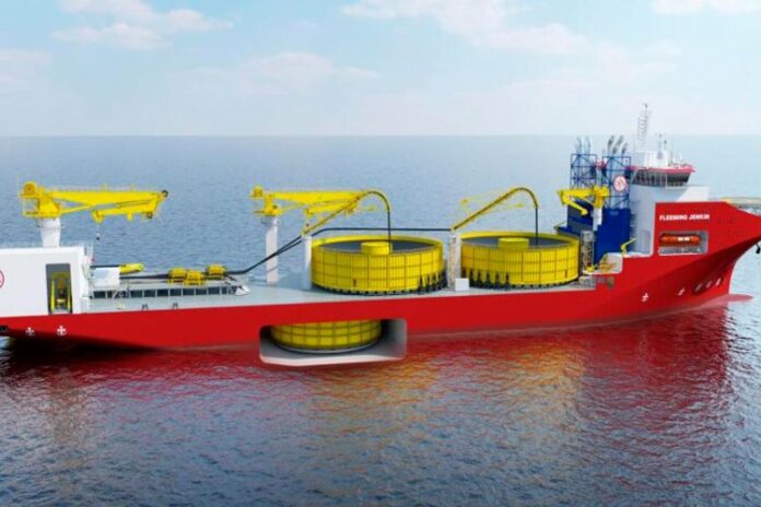 XL cable-laying vessel Fleeming Jenkin, an Ultra Low Emission vessel (ULEv) with unrivalled carrying capacity of up to 28,000 tonnes, will transport and install the 525kV HVDC offshore cables. The two power core cables together with the metallic return cable as well as a fibre optic cable will be installed simultaneously using the three (3) carousels and fibre optic tank onboard the Fleeming Jenkin.