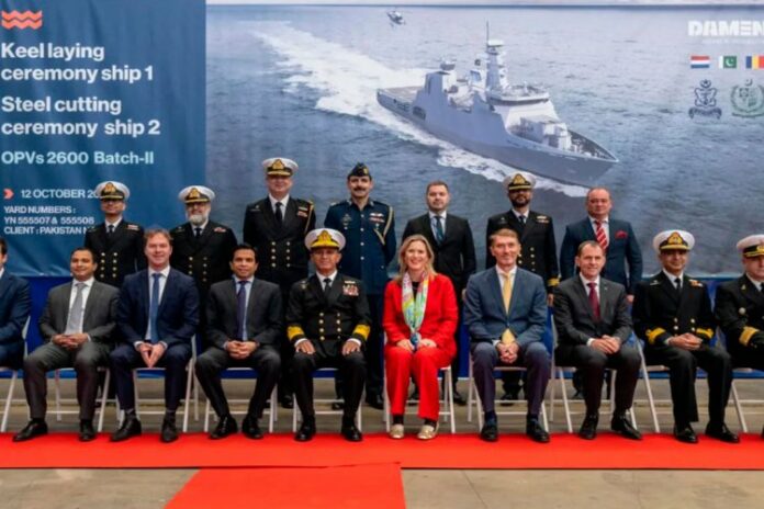 Celebrating the start of the construction of a second batch of two Offshore Patrol Vessels for the Pakistan Navy, the Chief of the Naval Staff Admiral Muhammad Amjad Khan Niazi performed the initial welding work on the keel of the first vessel at Damen Shipyards Galatí on October 12th 2022.