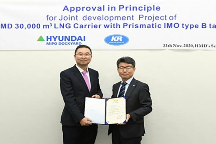 The Korean Register (KR) has awarded Approval In Principle (AIP) for an LNG carrier with a prismatic IMO type-B tank built by Hyundai Mipo Dockyard. The ship is a small to medium-sized LNG carrier with a B-type cargo tank developed as a result of a technical collaboration project between KR and Hyundai Mipo Dockyard, which began in February 2020.