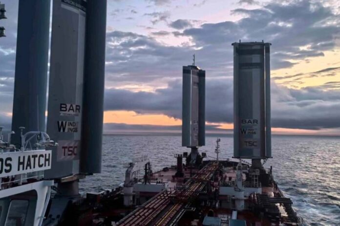 The LR-classed vessel is fitted with three 37.5-metre-tall WindWings® developed by UK-based BAR Technologies. These rigid sails are capable of intelligent aerodynamic adjustment in angle and camber to optimise aerodynamic efficiency, providing additional thrust that reduces fuel consumption and lowers carbon emissions.