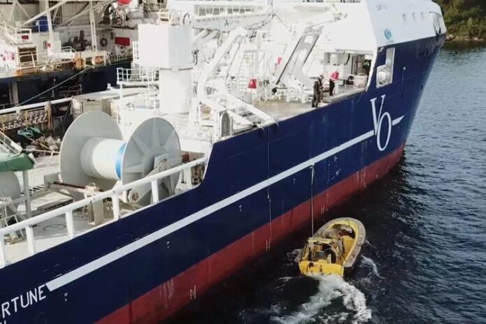 The vessel’s Fast Rescue Craft stood in for the USV for the purposes of the test and was equipped with a lightweight winch drum set up with dyneema rope and a robust Telescopic Pole. The dyneema rope is eight times lighter than an equivalent steel wire, keeping the total system weight to an absolute minimum. The vessel’s davit system was also modified to take the dyneema rope.