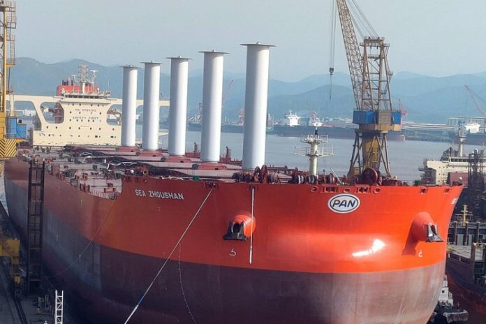 The new vessel, a 325,000 dwt VLOC is owned by Pan Ocean Ship Management and will be chartered by Vale after construction is completed in China. To enable efficient cargo operations, the five 24m high and 4m diameter Rotor Sails can be tilted by using hydraulic cylinders.