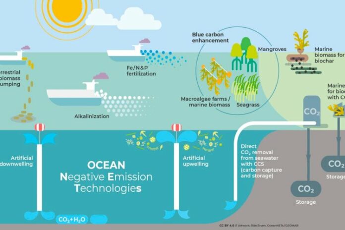 According to scientists, the ocean’s capacity to remove and store carbon dioxide from the atmosphere could be enhanced by various means, including the addition of alkaline substances such as olivine into the upper ocean, for example. This process, also known as alkalinization, harnesses chemical processes to alter the geochemistry of seawater and thereby increase the uptake of carbon dioxide from the atmosphere. Other potential methods rely on restoring or expanding coastal ecosystems such as mangrove forests, which can absorb and store carbon dioxide in underlying sediments.