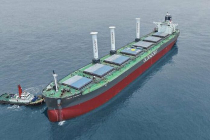 Equipped with Norsepower Rotor Sails™, the Chinook Oldendorff harnesses wind energy to generate additional thrust, expecting to reduce fuel consumption on transpacific routes by about 10-15%.