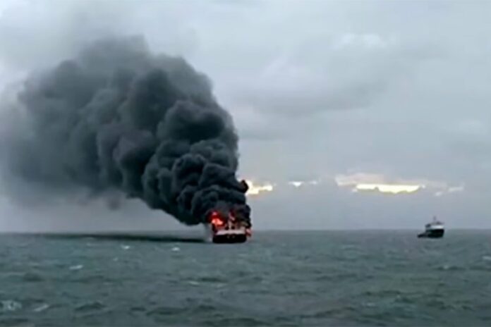 Fishing has been banned along an 80-kilometre stretch of coast near the ship that has been burning for 10 days despite an international firefighting operation.