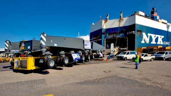 Mammoet was contracted to assist the customer, NYK Line, to load and unload the German-manufactured crane body onto the vessel Cassiopeia Leader. Mammoet moved the under carriage of the dismantled harbor crane from the quay side at the Port of Bremerhaven onto the “Roll-on/Roll-off” vessel. Once it had arrived in the USA a Mammoet team transported the 107-ton under carriage onto the quay side at the port in California. For both locations Mammoet sourced locally-available equipment, from a nearby terminal operator at Bremerhaven and from a nearby project in Los Angeles. This minimized the carbon impact of the transport and enabled a swift mobilization.