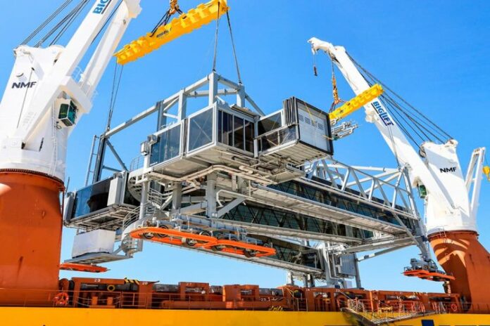 The airbridge arrived at 102 berth and was tandem lifted into position using specialist quayside cranes.