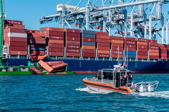 Two sunken cargo containers were retrieved from the bottom of the basin on Wednesday. Additionally, responders secured the source of a fuel leak originating from an at-berth emissions control barge moored alongside the container vessel. The tank contained about 2,000 gallons of renewable diesel.