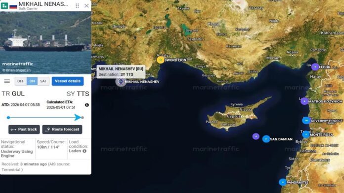 The vessel Mikhail Nenashev is heading to the Syrian port of Tartus with 27,400 tons of stolen Ukrainian grain.