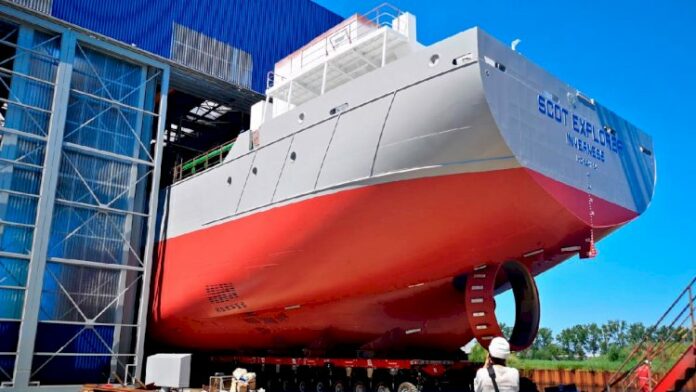 After the successful delivery of the Scot Carrier in November 2018, construction of the second vessel, Scot Explorer, started February 2019. Scot Explorer is seen here with the aft section leaving the brand-new production facilities at the Royal Bodewes Shipyard site at Hoogezand. The vessel is expected to be launched in October 2019 with final delivery shortly afterwards.