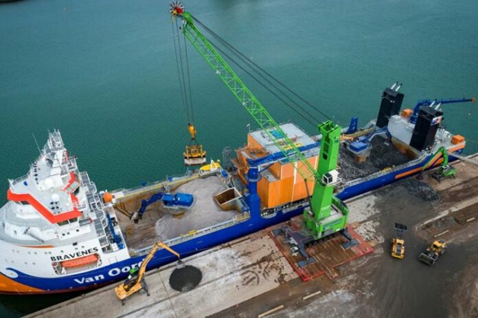 On 14 October, the stones were loaded onto Van Oord’s Bravenes subsea rock installation vessel in Vlissingen. The stones will be placed at the cable intersections over the coming weeks.