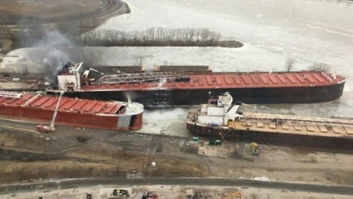 The fire was located on the stern of the St. Clair, a 762-foot vessel moored in the Port of Toledo for winter season repairs. No one was on board, and there was no cargo on the vessel at the time of the fire, which is currently under control. Preventative measures continue on adjacent ships using water-cooling techniques.