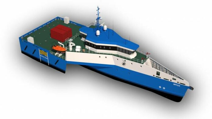 The MP625 is a diesel-direct vessel with four fixed-pitch propellers or four waterjets, according to the customer’s requirements, and two bow thrusters forward, one of them retractable. It is designed to maintain position in a sea state with waves of up to Hs 3.5–4.0 m. Accommodation is on the lower deck, with a personnel transfer room on the main deck and a VIP transfer room on the bridge deck. The wheelhouse is integrated into the forepart of the superstructure, and a DP control room is integrated into the aft side of the superstructure house at the bridge deck.