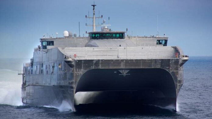 With an all-aluminum shallow-draft hull, the EPF is a commercial-based catamaran capable of intra-theater personnel and cargo lift. EPF class ships are designed to transport 600 short tons of military cargo 1,200 nautical miles at an average speed of 35 knots. The ship is capable of operating in shallow-draft ports and waterways, interfacing with roll-on/roll-off discharge facilities, and on/off-loading a combat-loaded Abrams main battle tank.