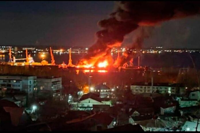 At 03:47, Lt-Gen Mykola Oleshchuk, Ukraine’s Air Force commander shared footage from Feodosia and reported that Ukrainian pilots destroyed the Russian Navy’s Novocherkassk large landing ship: