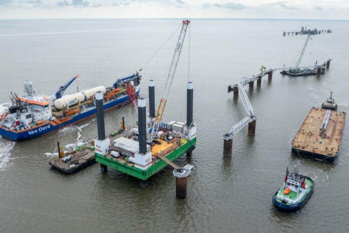 Van Oord was responsible for the procurement and construction of the FSRU jetty. In total, Van Oord installed 10 monopiles, including scour protection to prevent erosion. The foundations were then equipped with platforms, catwalks and furniture. The trailing suction hopper dredger Vox Apolonia was then deployed to dredge the berth pocket and turning basin to the required depth. This vessel runs on Liquefied Natural Gas (LNG), a more sustainable alternative to Marine Gas Oil (MGO), reducing sulphur, particulate, and nitrogen dioxide emissions.
