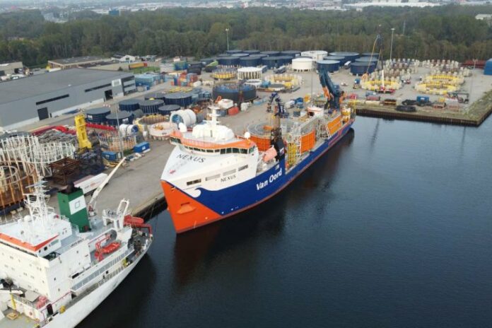 After Van Oord’s heavy lift installation vessel Svanen completed installation of all fifty monopiles for Iberdrola Deutschland’s Baltic Eagle offshore wind farm, Van Oord now continues installing transition pieces and starts cable installation. This week the inter-array cable loading onto Van Oord’s cable-laying vessel Nexus has commenced.