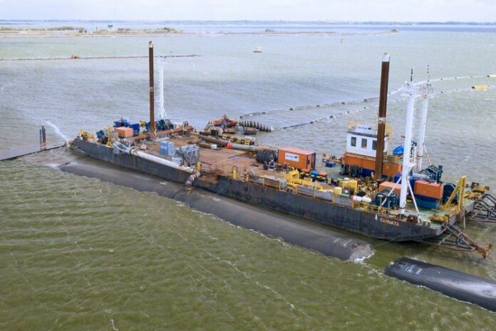 The 340 metre long dam is part of the construction work for the Fish Migration River project. Atlantis tubes are elongated bags made of specially developed plastic fabric which are filled with sand by dredging equipment. This is the first time the Atlantis tubes have been used to create a dam.