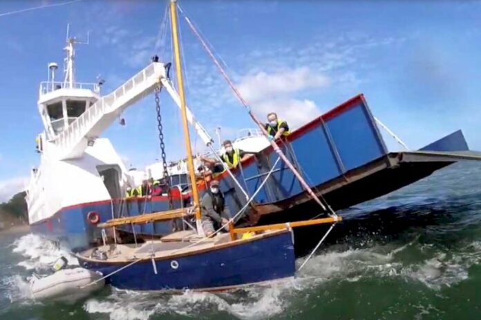 Thankfully the boat’s two occupants had been safely recovered to the ferry and the lifeboat crew were able to tow the stricken vessel free using their powerful Atlantic 85 lifeboat.