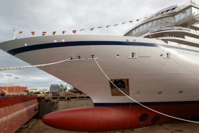 Viking Vela, the first of a new series of cruise ships that Fincantieri is building for the shipowner Viking, has been floated out today at the shipyard in Ancona.