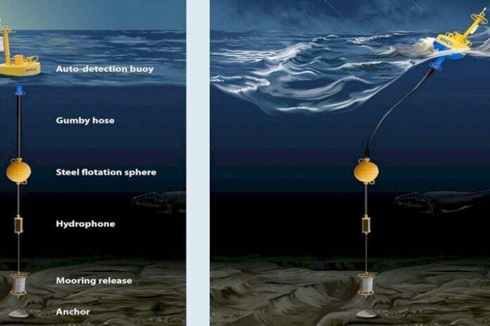 Hydrophones on mooring lines are able to detect whale sounds, but violent seas make it difficult to discern them from the sound of rushing water. To solve the problem, WHOI engineers designed a two-tiered mooring line, separated by a steel flotation sphere. In rough seas (right panel), the tough, stretchy “Gumby hose” on top acts like a bungee cord, absorbing the tension of the surface buoy. The bottom line is decoupled from the movements of the top line; it remains a stable, quiet platform for the hydrophone.